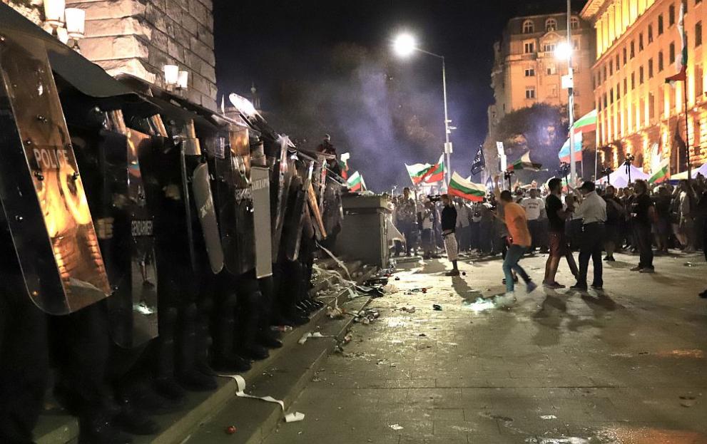 Ситуацията в "Триъгълника на властта" започна да ескалира малко след 21 часа. Първоначално част от демонстрантите започнаха да атакуват сградата на бившия Партиен дом с яйца и бутилки. А малко по-късно полетяха бомбички и към полицаите, охраняващи сградата.