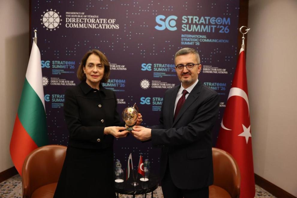 В рамките на международната конференция STRATCOM Summit 2026 г. министърът на външните работи на България Надежда Нейнски проведе среща вчера в Истанбул с ръководителя на СтратКом звеното към Президентството на Република Турция проф. Бурханеттин Дуран. От своя страна проф. Дуран подари глобус на външния министър.