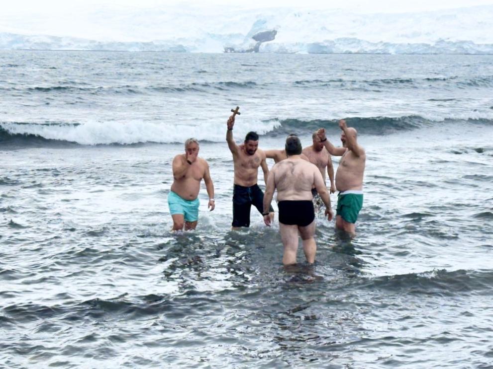 Светият кръст беше хвърлен в ледените води на Южния океан най-възрастния участник в 34-тата българска антарктическа експедицията - Анастас Абаджиев. Шестима души влязоха във водата, като Александър Найденов успя да извади кръста, съобщават от БАИ.