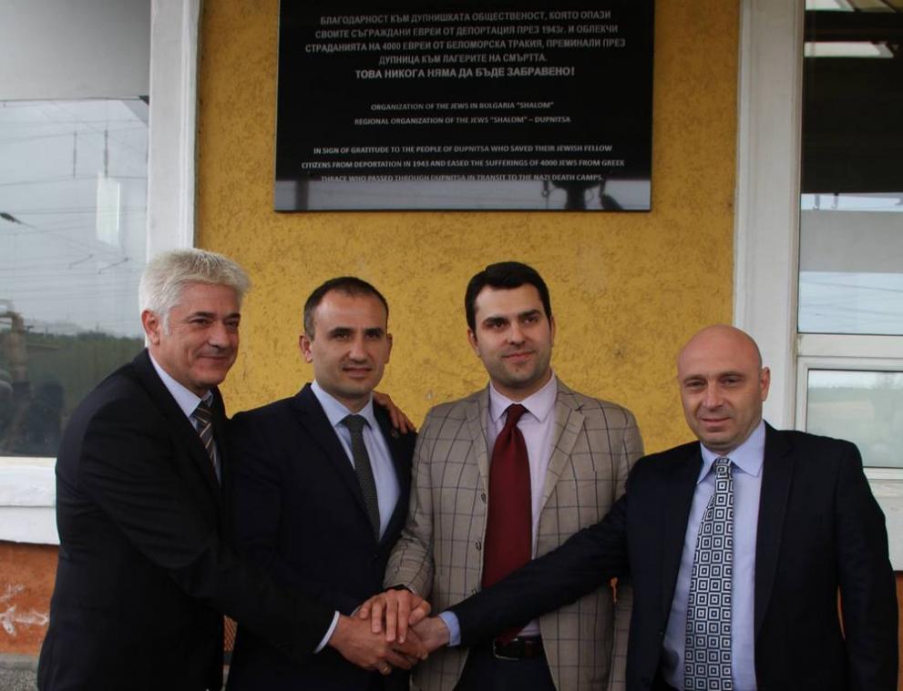 “Такива паметни знаци се поставят на места, на които се е случило нещо. Ние поставяме тази плоча тук, заради това, че нещо не се случи тук”, каза Леонид Хаздай, председател на местната структура на евреите „Шалом“. „Точно тук на тази гара бяха позиционирани влаковете съставени от конски вагони, в които повече от 1600 евреи от дупнишка околия трябваше да бъдат закарани за жертвеника на човешката лудост. За щастие тези влакове никога не тръгнаха“, допълни Хаздай.