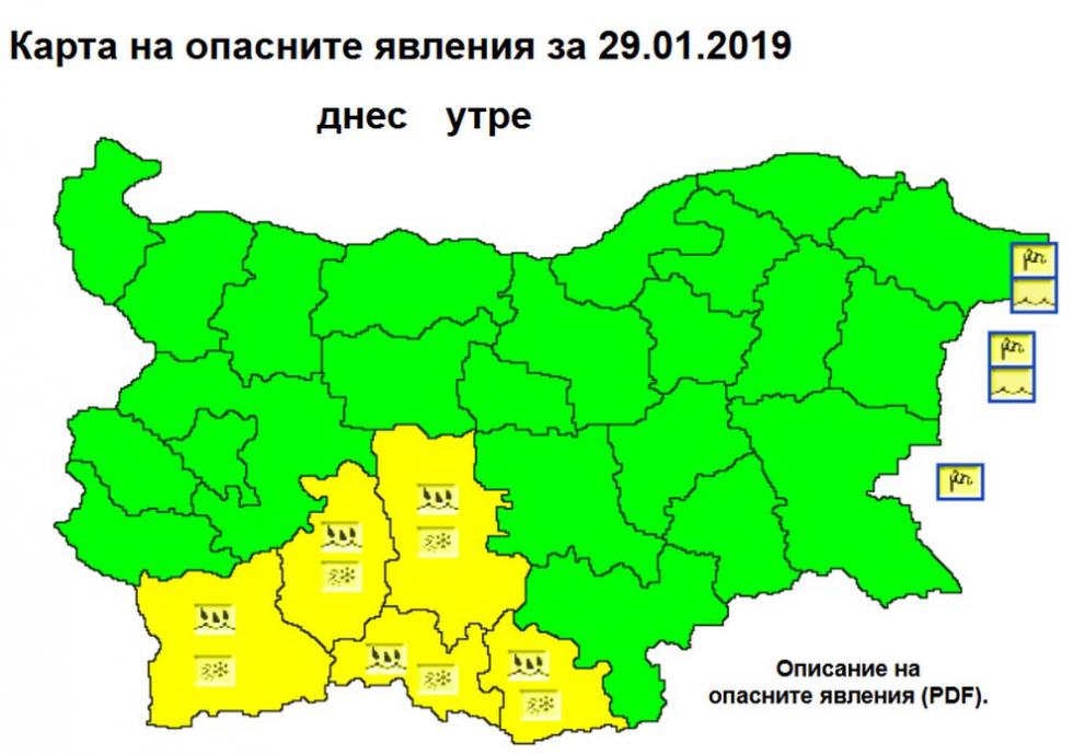 Жълт код за валежи от дъжд и сняг e обявен за областите Пловдив, Пазарджик и Смолян, сочат данни от сайта на Националния институт по метеорология и хидрология. Предупреждението за обилни валежи от дъжд и сняг важи и за областите Благоевград и Кърджали.