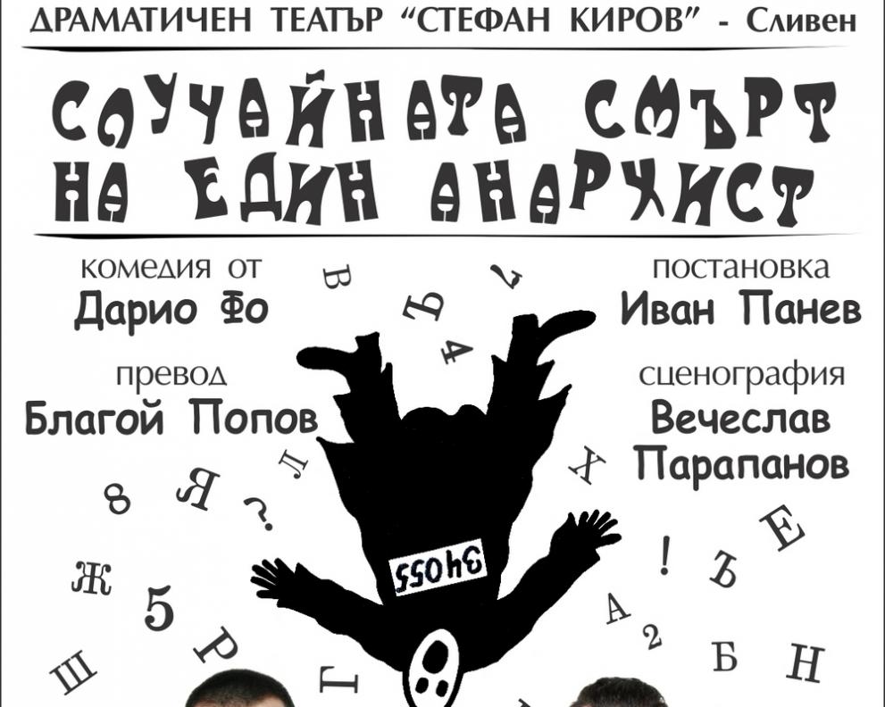 Постановката „Случайната смърт на един анархист“ е комедия от Дарио Фо. Постановчик е Иван Панев, а сценографията е дело на Вячеслав Парапанов. Участват актьорите Камен Воденичаров, Георги Спасов, Августин Демерджиев, Димитър Марков и Вяра Начева.
