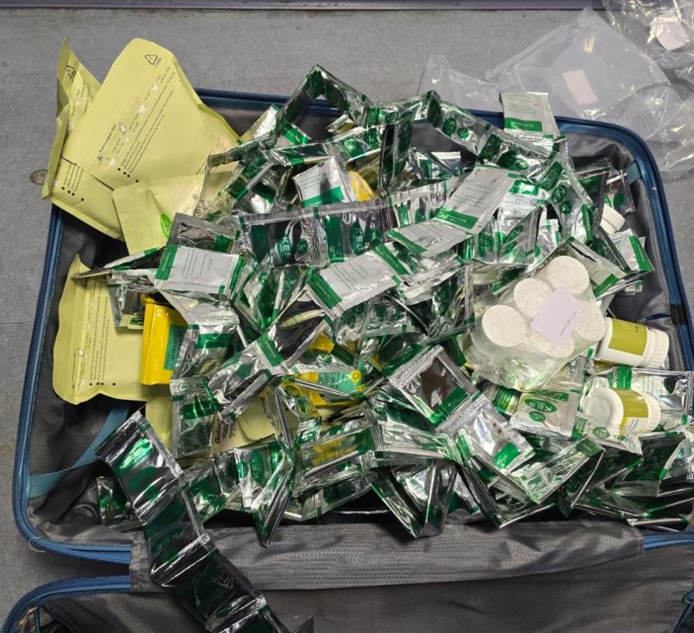 След инспекция на багажа им с рентген, в куфарите им са установени еднородни вещи. При обстойната митническа проверка на регистрирания им багаж са открити по 42 вида различни лекарства, медицински, билкови и други продукти под формата на таблетки, сиропи, прахове, гелове, семена и чайове. Иззети са общо 7840 таблетки в блистери и шишенца, както и над 6 кг прахообразни вещества в шишета и пакети. Пътниците са заявили, че пренасят стоките за техни приятели и не са знаели, че е трябвало да ги декларират.