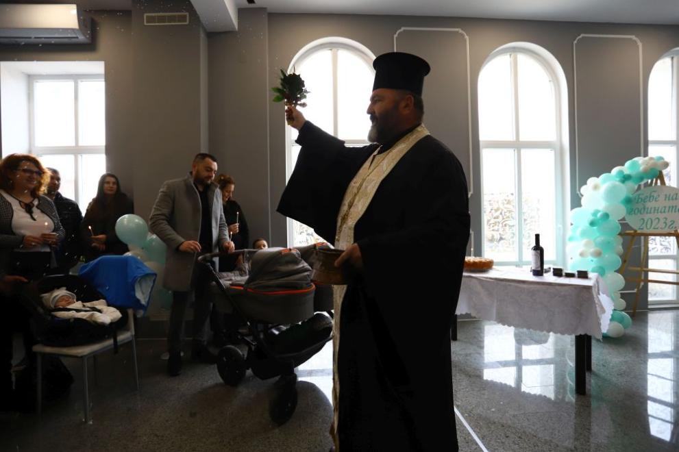 Отец Иван Плещов отслужи водосвет за здраве на първите бебетата в община Елин Пелин за 2023 г., както и за здравето на техните родители. "Винаги с трепет идвам на това събитие, защото животът е подарък от Господа. Нека всички деца да са здрави, да растат весели и щастливи", пожела той. По думите му децата са с чисти хард дискове, няма нищо записано, затова родителите трябва да внимават какво влагат в тях. "Много са важни първите стъпки, първите години", каза още духовното лице и се обърна отново към родителите с призив във вкъщи да създадат истински човеци.